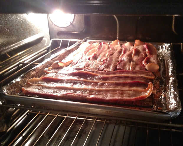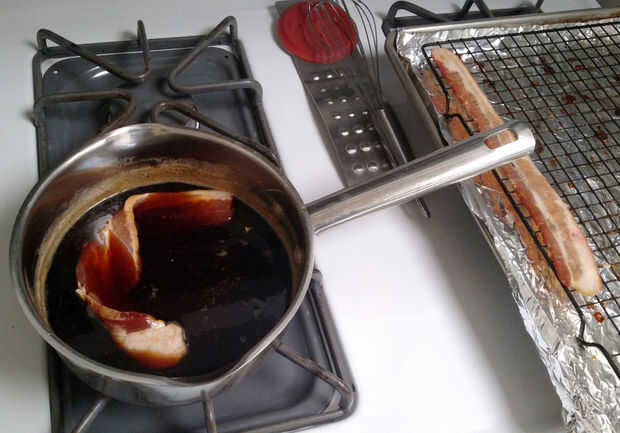Después de los sabores mezclan durante 5 minutos o menos, me salió mi tocino y había sumergido en el esmalte antes de pegarse en la rejilla. Si no has probado hornear tocino, necesita. Sale gran! Me parece que me gusta más cuando utilice una rejilla de hornear y ponerlo en la hoja. La mayoría de la grasa representa hacia fuera y se sienta abajo el tocino para que no sea excesivamente graso. Hay diversas opiniones sobre cómo largo y qué temperatura cocinar esto, pero generalmente cocinan a 350 grados durante 30-45 minutos dependiendo del grosor de tocino. Chequeen en él hasta conseguir la textura deseada crujiente. Saqué la hoja hacia fuera un par de veces durante el horneado para aplicar el esmalte en el tocino nuevo con un pincel de silicona. Seguir reduciendo la mezcla de cerveza abajo para concentrar los sabores de una llovizna en el extremo. Mientras que se cocina, haz la masa establecida.