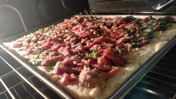 La cociné la masa durante unos 5-10 minutos antes de que añadí ingredientes porque quería la corteza quieres algo crujiente. El Bacon y glaseado extra se van a ir en la parte superior y no quiero que sea caldoso.
