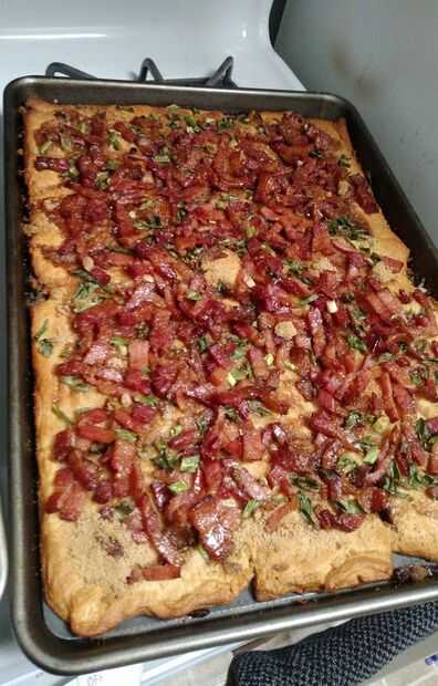 Una vez que fue de mi agrado, me había picado encima de la cebolla verde y tocino y ponerlos en la parte superior. Yo entonces salpicada la tapa todo con más azúcar morena porque quería que caramelizar un poco mientras el resto cocina y unir todo. Yo también había cubierto el resto del esmalte cerveza/azúcar encima todo para condimento más. Todo esto cocido durante 15 minutos o así ya. La masa se crujiente y el azúcar moreno encima derretido en los ingredientes. Deja que se enfríe un poco y cortar en trozos para servir.