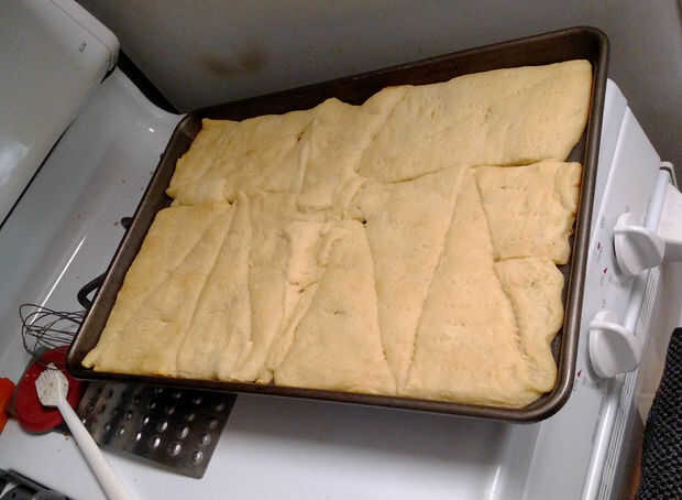 Usé masa Pillsbury media luna rodillo para hacer las cosas fácil. Realmente rodó hacia fuera bastante perfectamente en mi bandeja. Una vez que la masa en la hoja, usé un tenedor y asomó un montón de agujeros en toda la masa. Esta masa es generalmente bastante esponjosa una vez cocido, y quería mantenerlo un poco más plano y más crujiente.