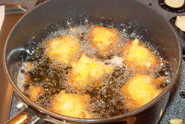 Deje caer la mezcla por cucharada en aceite, con cuidado para sostener la cuchara cerca el aceite caliente para evitar salpicaduras.