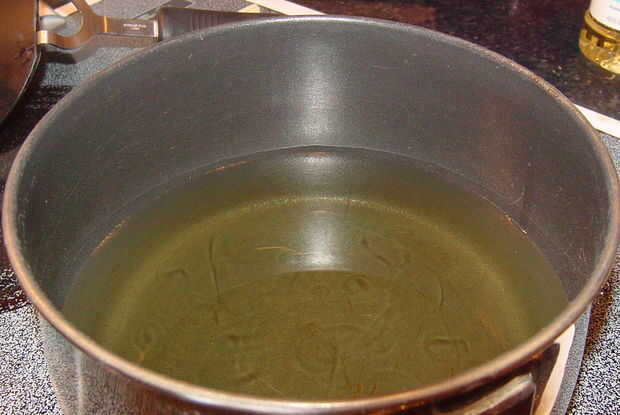 Calor aproximadamente 2 pulgadas de aceite en la cacerola a 350° (utilice un termómetro)
