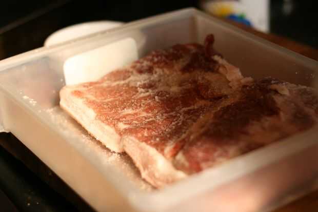 Recortar los bordes de la panceta de cerdo limpio y cuadrado y luego presione a la cura seca dar una capa gruesa y uniforme.
