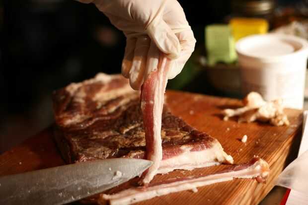 Una vez que el tocino es curado, enjuáguelo y acaricíele seca.