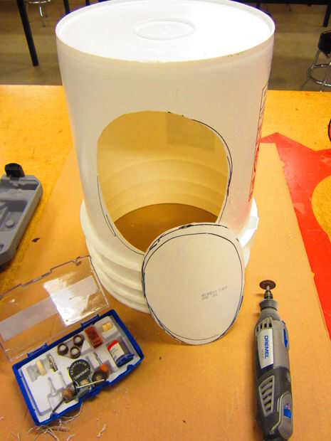 Quería un agujero cubby para almacenar libros y cosas. Empezaremos por cortar una puerta importante. suficientemente grande como para montar una buena selección de materiales de lectura. Usé una dremel con un disco de corte resistente y funcionó como un encanto. Corte a través de ese plástico como mantequilla. Feria ADVERTENCIA sin embargo, hace un lío y va cubierto de plástico nieve para el resto del proyecto. También, gafas de seguridad son recomendadas aquí como cubo bits tienden a ir volando hacia su cara.