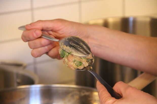 La mejor manera de hacer las bolas es mediante el uso de dos cucharas. Tomar una cuchara con una cuchara y utilice la otra para formarla. Cuando se hace uso que forma esa segunda cuchara para tirar la bola recién hecha en la freidora o sartén.