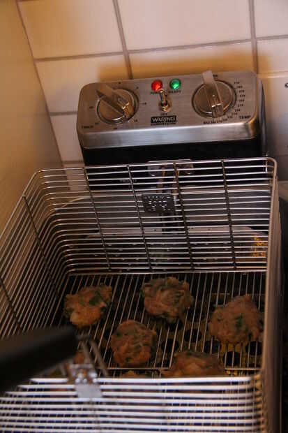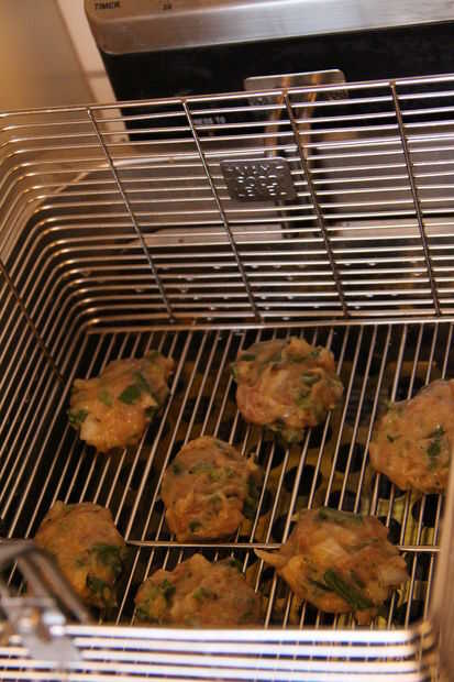 Freidora- fijar a 350 grados. Cuando el aceite esté listo, deje caer cucharadas dentro de la canasta elevada. Baje en el aceite y freír por un minuto y medio o hasta que doren, movimiento que no se pegue al fondo. Set en bolsa de papel toalla o comestibles.