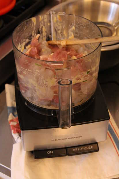 procesador de alimentos agregue el pollo, camarones, azúcar, huevo, salsa de pescado y curry. Procese hasta que esté bien picado pero con algunos pequeños trozos aquí y allá. Esta parte merece la preferencia. Me gusta mina un poco espesos. El tipo que encontrará en los restaurantes son generalmente bien procesado sin trozos.