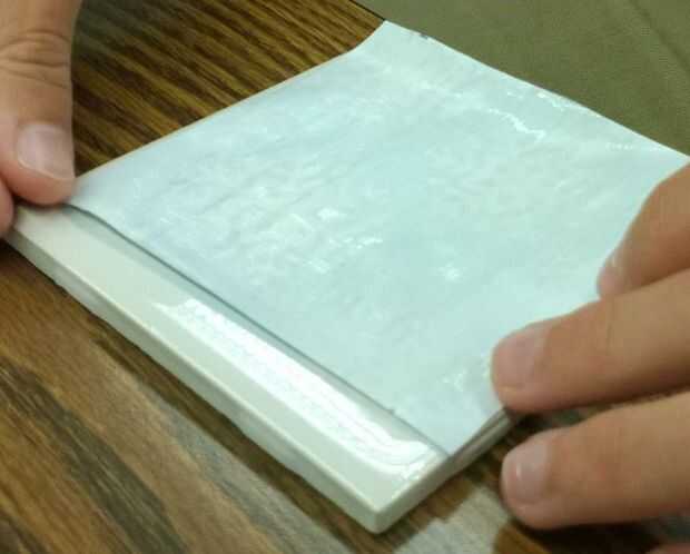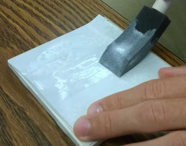 Voltee la pieza cortada de papel y pegamento una fina capa de mod podge en la parte de él. Asegúrese de utilizar una fina capa de mod podge porque demasiado puede causar burbujas cuando se coloca el papel sobre el azulejo.
