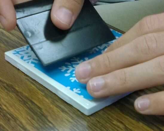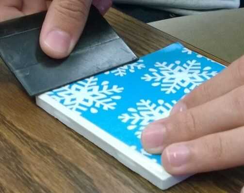 Ejecute la boquilla hacia afuera a lo largo de la parte superior del papel, deshacerse de cualquier burbuja. Cuidado con la escobilla de goma, que no desea rasgar el papel. Dejar secar durante unos minutos. Cinco minutos debe ser lo suficientemente largos. (Nota: Si no se encuentra una escobilla de goma la botella mod podge, se trabajará también en suavizar las burbujas de aire)