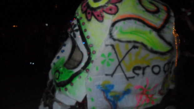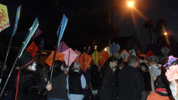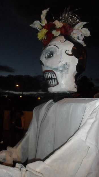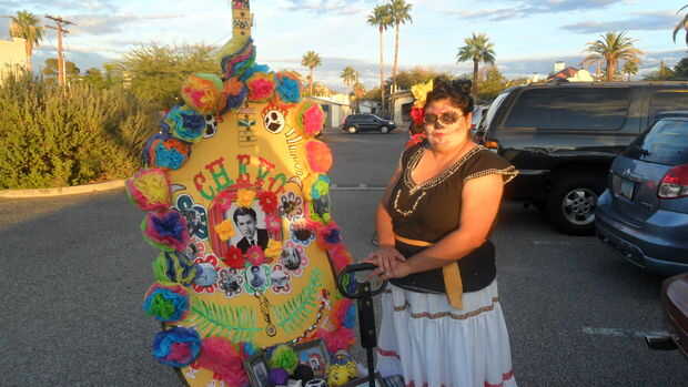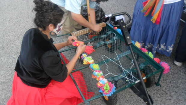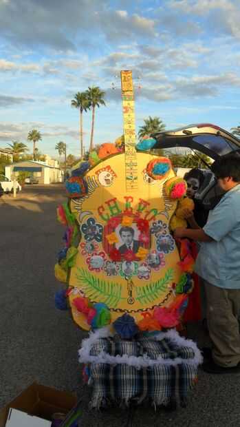 En el desfile real vestido en garb mexicano y pintar nuestras caras como esqueletos. Las chicas a veces llevan flores en el pelo. La ruta del desfile es largo y es una sensación agradable de la comunidad. Si estás en el área de Tucson, lo recomiendo el año próximo. Es una hermosa galería de arte itinerante. Mira para altar de Chevo, porque allí estaremos.