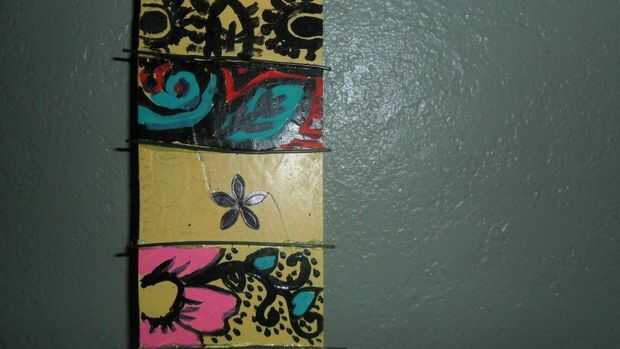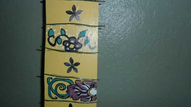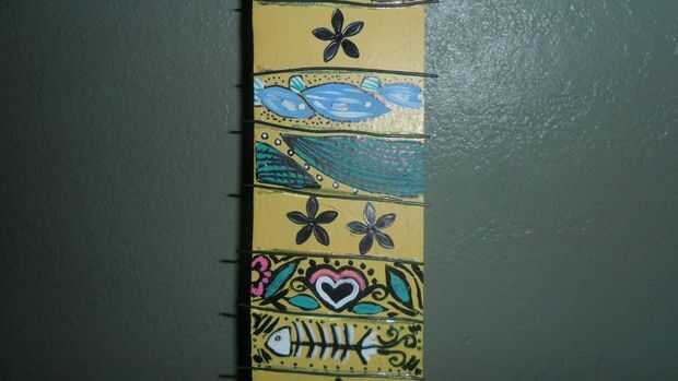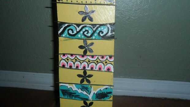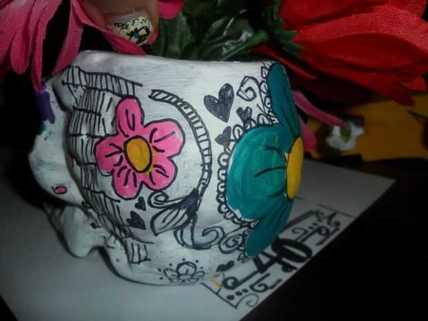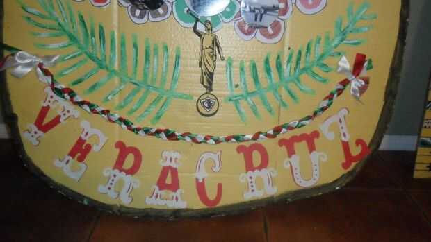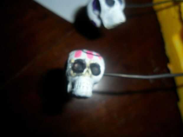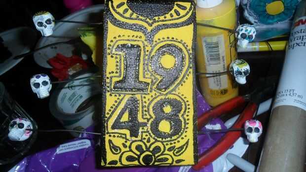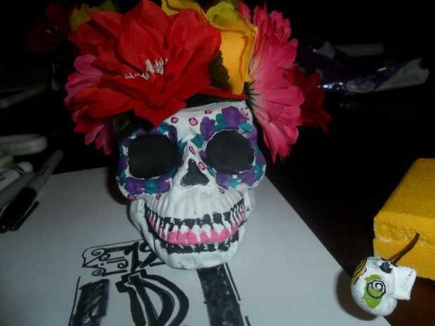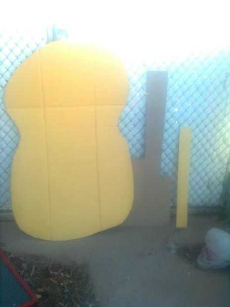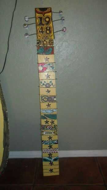 Tengo un pedazo grande de cartón (cortesía de un chasis) y pintado. Tuve algunos chatarra prensado de fibra de madera y había hecho un cuello. Tuve algunas styrafoam y había hecho una cabeza. Fui a mi tienda de confianza dólar y recogió algo calaveras para pintar y decorar. En la guitarra real tenemos imagen de papá y he tratado de pintura/decorar cosas relacionadas con su vida. Dad de Veracruz, un estado frente al mar en México así que pinté hojas de Palma y esqueletos de pescado.
