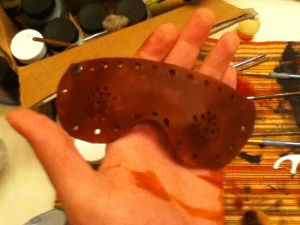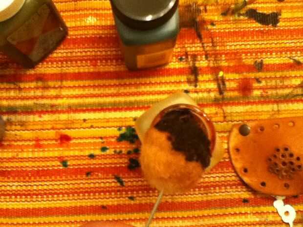 Sí es el momento adecuado para teñir y agregue un cierto color. Utiliza un tinte de tandy color marrón madera, pero utiliza cualquier color usted por favor. También, había sumergido un Embadurnamiento de lana en al medio y frota contra la piel que es húmeda.