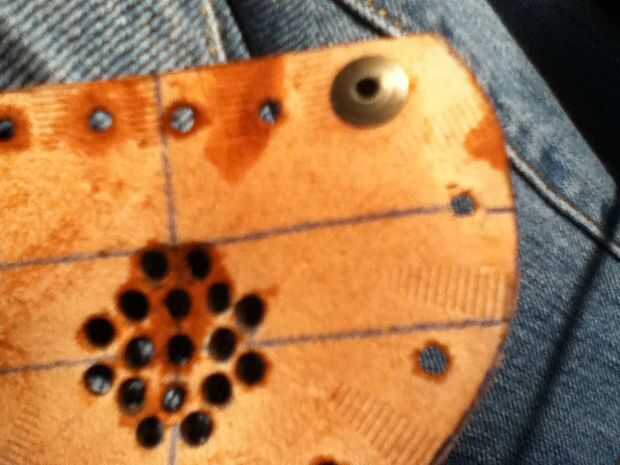 bueno otro paso opcional, no tienes que usar remaches y aconsejamos no hacerlo. no se puede utilizar doble redondo tapa y remaches regulares pero lo que sea. No olvide asegurarse de que tiene dos remaches para la fijación de las cosas que siente en sus oídos. la goma laca también las piezas antes de volver a poner juntos. y asegúrese goma laca antes de u hecho moldeado final
