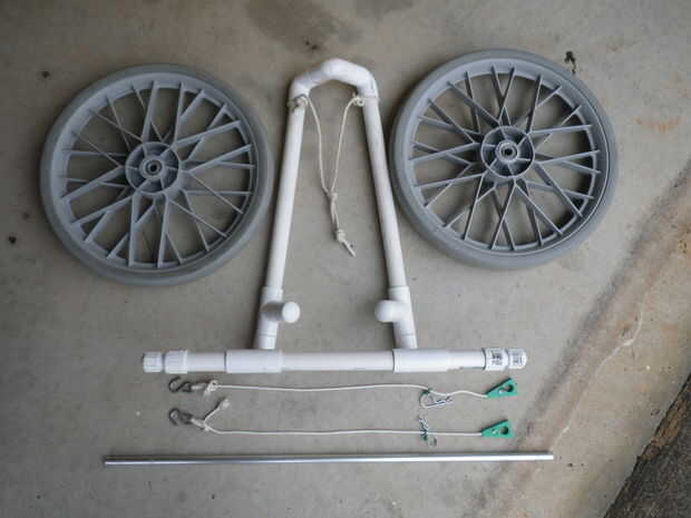 Un par de ruedas. Este es el elemento más importante antes de comenzar ya que impulsará su diseño. ¿Buscar carros de golf en su tienda local o volver a propósito un par de ruedas de bicicleta para niños? El diámetro más grande, metálico son ideales para evitar corrosión y pinchazos. Los que encontré eran de un carrito de golf.