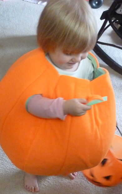 Cuando se cosen los bordes, la calabaza con estructura. Utilizar un modelo para obtener colocación de agujero del brazo correcto. Con 12 segmentos visibles en la calabaza, terminé con 4 segmentos en el frente, luego los segmentos de agujero del brazo, y 6 segmentos en la parte posterior. Parecía funcionar bastante bien.