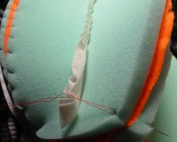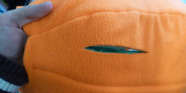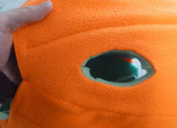 Inicialmente, pensé que sería bueno empujar la aguja a través de la espuma y la costura del paño grueso y suave en el medio, pero no creo que sea necesario. Si decides pasar por el paño grueso y suave, asegúrese de ir sólo a través de la parte sobrante de la costura del paño grueso y suave, no la parte buena. Si vas por el lado bueno de la costura, la puntada se mostrará en el exterior cuando se gira la calabaza derecho-lado-hacia fuera, y no ven muy bien.