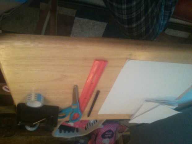 Para este proyecto relativamente simple, necesitarás, endurecido papel dos o tres hojas, en caso uno sale malo, un lápiz, tijeras, cintas y una regla en caso de exactitud, (opcional) un alambre y alicates.