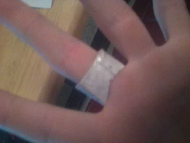 Por último, tomé mis tijeras y corte un v muy amplia en la banda para que sea así yo puedo doblar mi dedo.