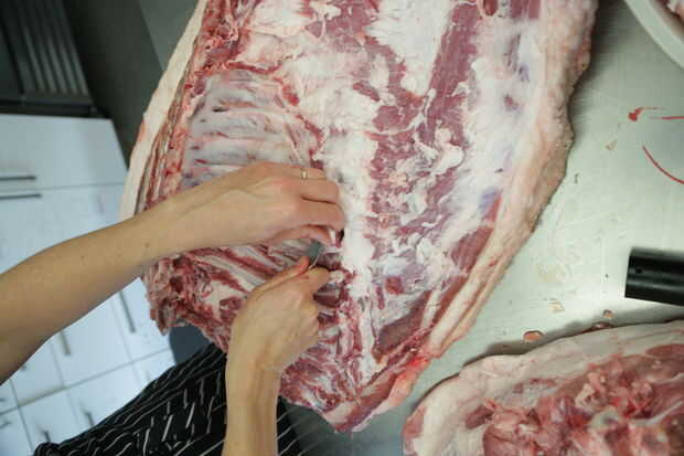 Cuenta regresiva de cinco costillas de primera, luego cortar entre la 5ª y la 6ª costilla. Debe deslizarse a través de. La columna vertebral se sostenga en su lugar, tan rápido.