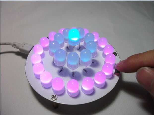 Cable de datos USB de acceso como una fuente de alimentación, dedo de la Junta de PCB tocando la derecha "botones touch" se puede cambiar para ver más efectos de colorchanging. Este patrón puede verse en la figura LED producen diferentes colores y brillo diferente, muy bonito.