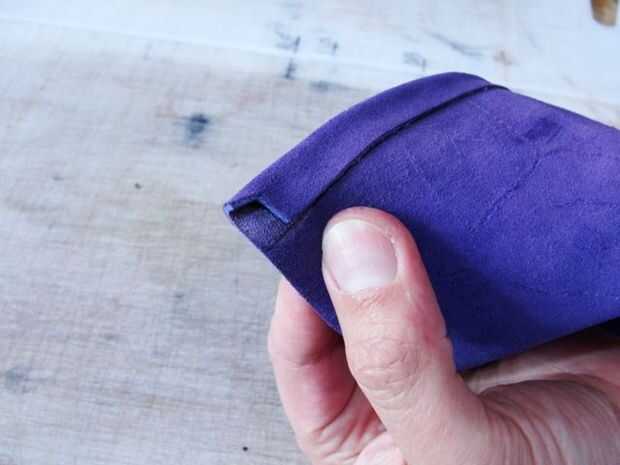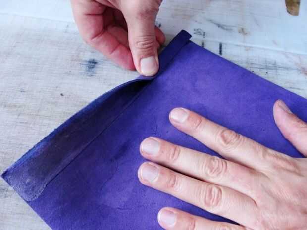 Pintura con cemento de contacto y deje secar un poco.   Luego doblar sobre su marca de una pulgada.  Clip dentro de esquinas con tijeras para reducir volumen (ver fotos 6 y 7).  Golpéelo con un martillo suave.