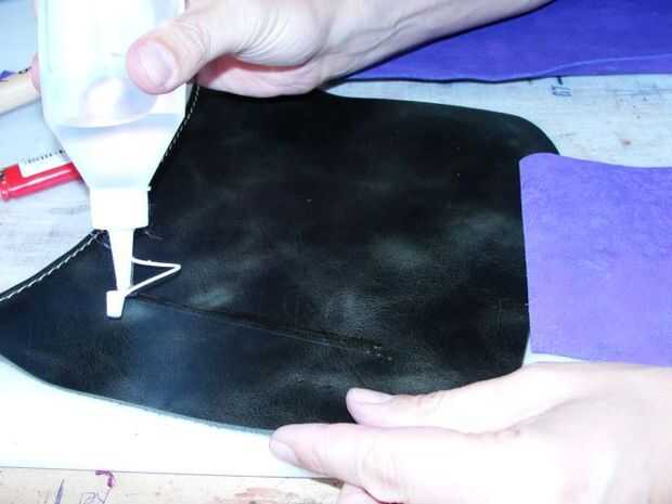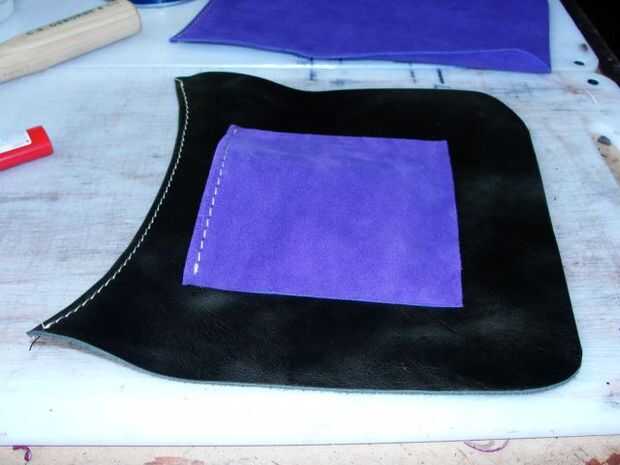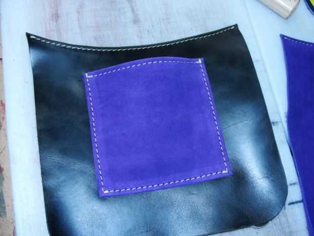 Con una lezna rayado ligeramente marca donde van pequeño bolsillo.  Pega en el bolsillo y coser.