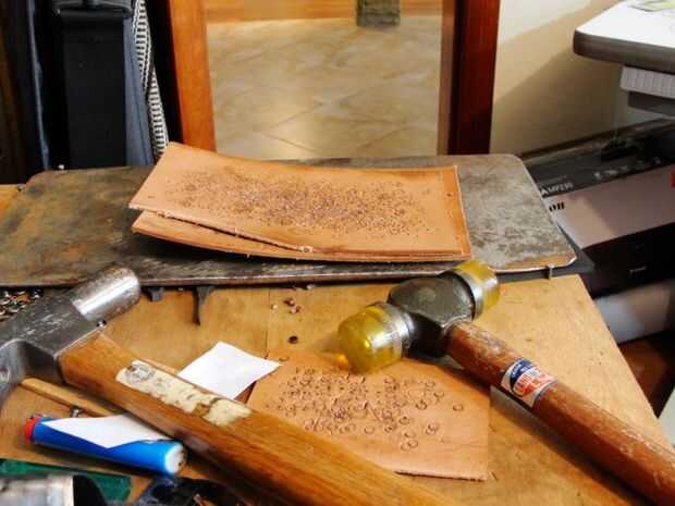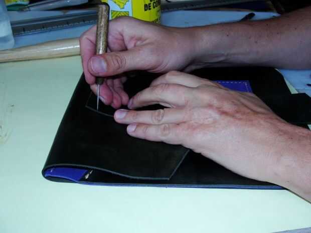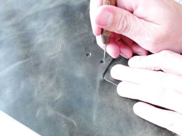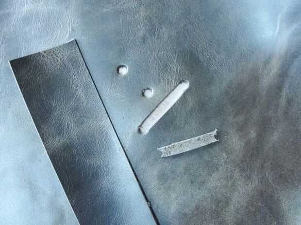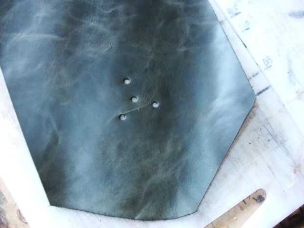Perforar dos agujeros paralelos para ranura de correa y dos agujeros para remaches.