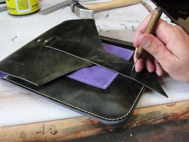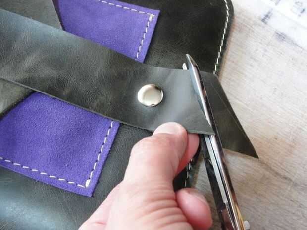Luego marque donde se alinea el agujero de la correa en la manga. Punzón, colocando una pieza de metal con un trozo de cuero en la parte superior dentro del bolsillo.