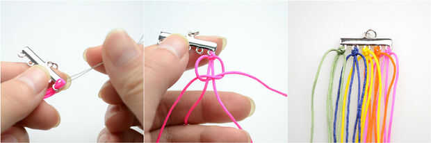 A continuación, pasar los dos hilos de color misma un agujero en su cierre utilizando la sección de permanecer el alambre de la cola del tigre; Tirar de los hilos y fijar atando un nudo cuadrado. Mantenga el hilo consejos estancia simétrica. Lo mismo para los siguientes cuatro colores.