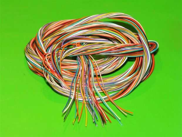 Para llegar al cable, todo lo que tienes que hacer es cortar los conectores y corte a lo largo de la longitud del cable suficiente para conseguir un buen agarre en los alambres, luego saque el cable y el aislamiento aparte. Ahora tiene longitudes de 25 x 2 metros de alambre de enlace en todos los colores del arco iris (y algunos más) que latas fácilmente y no se comprime cuando soldadura. Eso es suficiente para una feria de algunos proyectos.