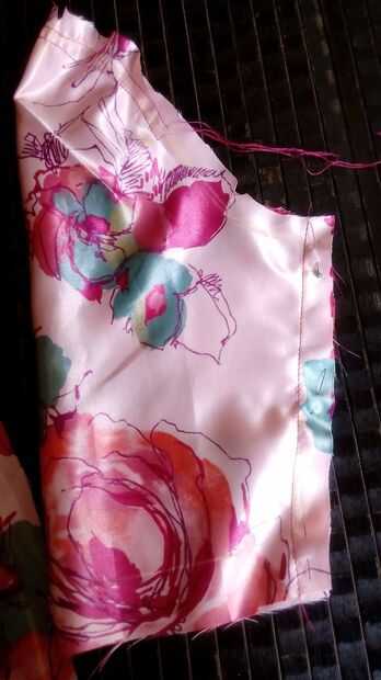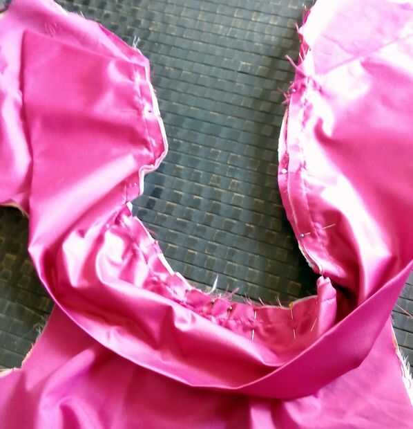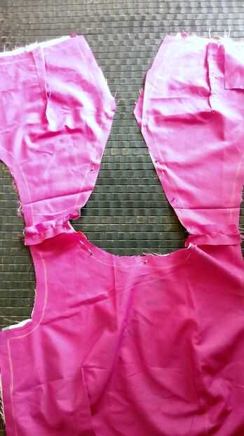 3. coser las piezas delanteras y traseras que ha cortado de la tela en las costuras de los hombros. Hacer lo mismo con la tela del forro