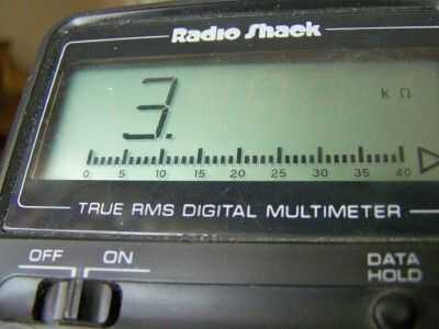 En mi medidor el dígito "3" indica un circuito abierto (= no hay camino para la corriente eléctrica). Si estoy utilizando la escala de ohmios (resistencia), el dígito "3" aparece hasta que conecte las sondas al dispositivo que estoy probando. A veces el dígito "3" cuando permanece conectado a un dispositivo conocido por ser bueno. Debe haber una lectura real, pero la razón no es que no tengo el medidor a un rango incorrecto. El dispositivo ¡ estoy revisando (por ejemplo) tenga un valor de resistencia de ohmios 12.500. Si el medidor se establece en un rango muy bajo, quizás a la gama de 4K, el dígito "3" aparecerá en la pantalla. Si mueve el selector a la gama de 40 K el metro pronto dará la lectura que busco. Trato de recordar que comienzan en un rango muy alto que no me dé tantos números en la lectura como espero ver. Entonces mueva el selector para bajar ajustes de rango hasta que veo el número de dígitos en la lectura para la precisión que necesita.
