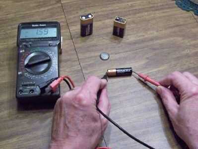 En la foto se muestran varios tipos de baterías común: una batería de la cámara de 3 voltios, una batería de 9 voltios "radio" utilizado en detectores de humo y otras cosas, una pila de botón utilizadas en relojes y otros instrumentos y una batería AA comun. En esta prueba la batería AA registra 1,59 voltios, que es nuevo en condiciones.