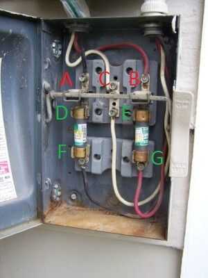 Si desea comprobar los fusibles sin ellos se cargan eléctricamente, mueva la palanca a la posición "off". Ponga el medidor CONT. tacto una sonda a la D y la otra a f el. Oirá el tono estridente del medidor. Ahora coloque una punta de prueba en E y el otro en G. Oirá el tono otra vez. Esto también indica que los fusibles están bien. Si uno de los fusibles no prueba bien, estar seguro de que el interruptor esté en la posición "off". Con los dedos o con un par de pinzas o un palito de madera para, quite el fusible mal. Lleve con usted a un hardware o suministro almacenar y obtener un reemplazo. Use un fusible. No use un pedazo de metal, un pedazo de tubería de cobre o un cable con pinzas de cocodrilo para salvar el espacio para el fusible. En los días cuando la mayoría de los hogares tenía Tornillo Tapón fusibles de algunas personas a veces poner un centavo de cobre detrás de un fusible cuando no tienen un fusible nuevo. Entonces olvidaron a menudo sobre la peseta. Monedas de un centavo no quemen lejos como un fusible lo hace cuando hay una sobrecarga. Bajo utilizado de esta manera a menudo causó incendios de casa. Había una frecuente diciendo que, "las palabras"en Dios confiamos' fueron colocadas en monedas de un centavo en beneficio de quienes las usan como fusibles".