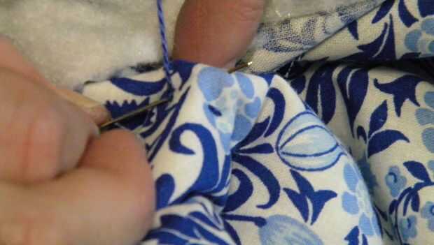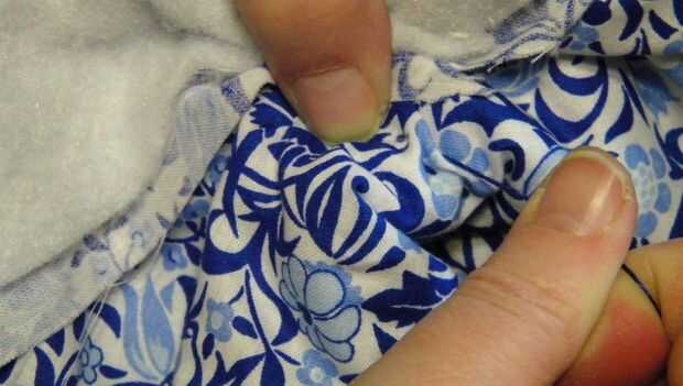 En última puntada empujar todo el camino a través de la colcha en la parte posterior. (Usted puede terminar en la parte delantera. Es una cuestión de preferencia. La policía de edredón puede tener reglas pero hacemos lo que funciona para nosotros).