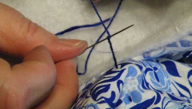 Deslice el lazo en la aguja hasta la parte trasera de la colcha donde sale el hilo.
