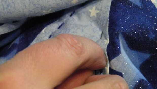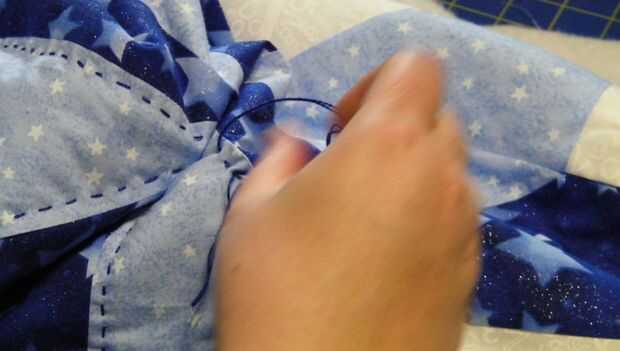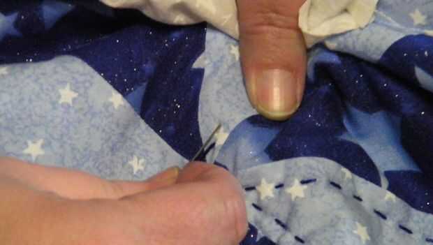 Aviso que no estoy usando a ningún tipo de marco. Recojo a la tela de la colcha de la parte trasera en mi mano izquierda. Soy costura zurdo. Me imagino que haría lo contrario si usted izquierda fueron entregados. Algunas veces, yo difundirlo hacia fuera en una mesa si estoy trabajando en el centro del edredón o teniendo dificultades para agarrar a la tela.