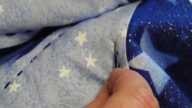 Partir de aquí, usted estará trabajando desde la parte superior de la colcha. Vas a hacer puntadas de funcionamiento después de la costura o el patrón que ha dibujado. Estos no son rectos y puntadas. Realmente van en un poco de un ángulo mediante el bateo.