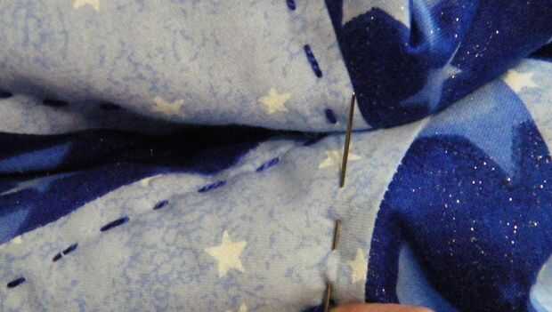 Tire del hilo a través de. Ser firme pero no tire tan fuertemente que la tela se arrugar_.