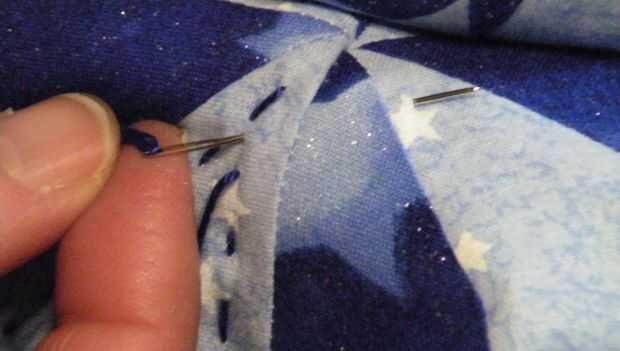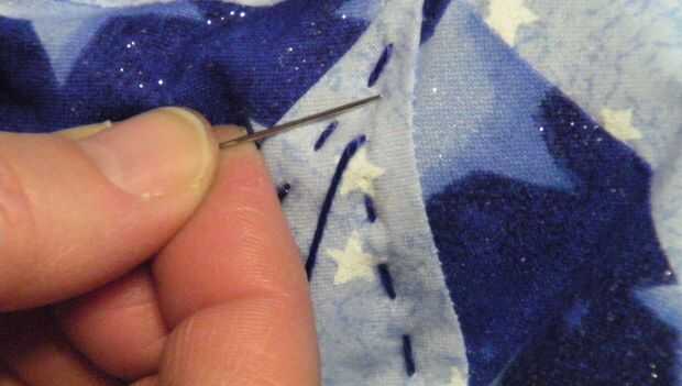 Usted simplemente empujar la aguja a través de la capa superior y en el bateo al final de su última puntada. No la empuje por la parte posterior. Empujar la aguja hacia arriba a través de la capa superior donde quieres que inicie otra vez.