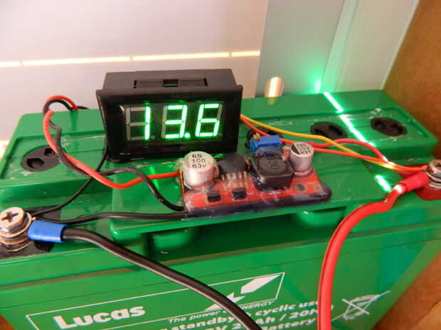Poner el panel solar en el sol y conéctelo a la entrada del convertidor buck. Poner el multímetro en la salida y ajuste el potenciómetro multivuelta hasta Lee 13.8v. Lo que estoy recomendando un convertidor del buck es que puede mantener la batería en una tensión de flotación. Probé un controlador de carga solar pero tenía la batería en 14.8v y fue gaseado. El controlador de carga no cayó a 13.8v y no había manera para ajustarlo.