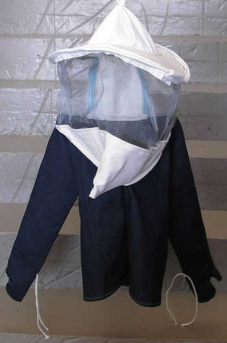 Durante las experiencias de la abeja, hemos encontrado que un traje completo no es necesario; Si ya no habíamos comprado dos mucho tiempo hace que no se usarlos. Las partes más importantes son el velo y los guantes, más allá del cual sólo necesitas pantalones vaqueros y una camisa de manga larga. Sin embargo, ya que Leo no tiene realmente ningún camisas que sean de espesor suficiente material, pensamos que una chaqueta podría ser una buena idea. También, para una de seis años de edad, de pie pacientemente mientras que ata para arriba todos los bits y piezas de un velo adulto es extremadamente dura, así que siguió adelante y hacer un todo en un velo, guantes y chaqueta. Todo lo que tenemos que hacer es deslizar sobre su cabeza y relampaga para arriba. Es impresionante, y él está encantado de que llegue a mirar las abejas cerca.