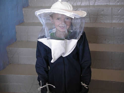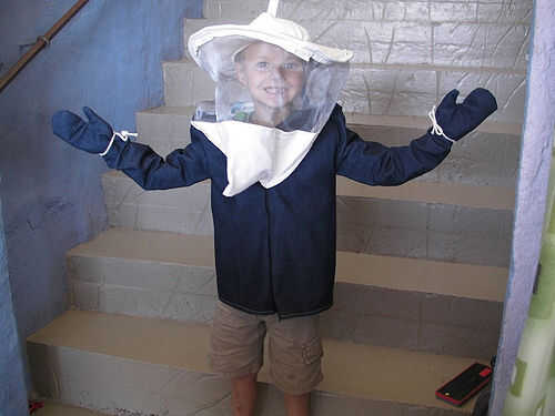 El otro paso que llevamos al enjambre que cogimos recientemente es vigilar más cerca de ellos y observe cualquier comportamiento errante. De esta manera, nos encontramos con un problema inesperado: fascinación de nuestros seis años de edad. Como Leo va creciendo, su interés por la Ciencias naturales es cada vez más aguda. Y con las abejas, pide poder ir cada vez que uno de nosotros se adapta para arriba. Por lo tanto, decidimos hacerle su traje de abeja.
