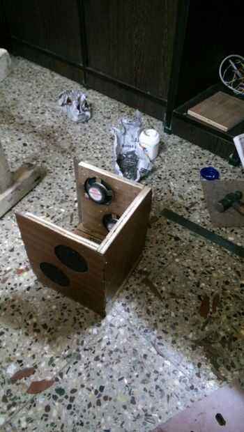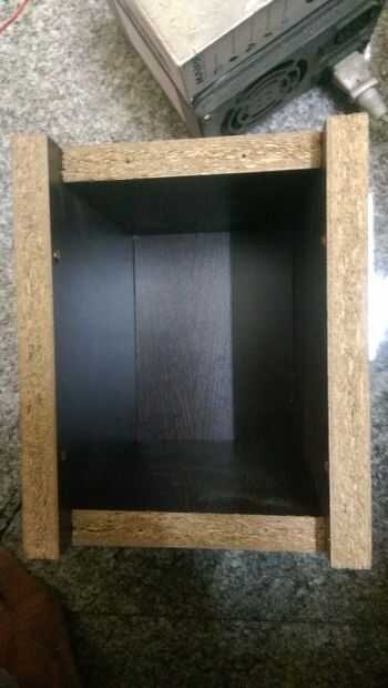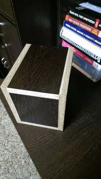 Las dimensiones de la caja fueron calculadas en la visión con las dimensiones de la batería de 12V 7Ah exide, altavoces y espacio extra para otros componentes del circuito. Entonces todos los lados fueron atornillados a sus caras adyacentes con tornillos largos de 2 a cada lados.
