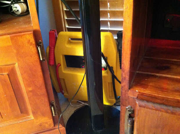 Detrás del entretenimiento unidad es un paquete de jumpstarter de coche de 12V que tiene una capacidad de 22Ah y está constantemente goteo cargada. Ser portátil, consigue un montón de uso exterior. Tengo un tanque de agua de lluvia de 2300 litros que extraje de con una bomba de baldeo marine 12V y este pack me permite lavar el filtro de la piscina y hasta tres coches antes de que se a 50% de profundidad de descarga.