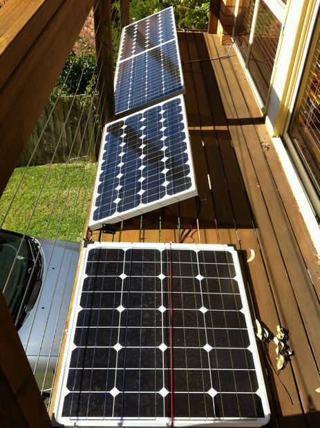 Estos paneles son 80w todos y clasificada en 4.4 amperios máximo cada uno pero el controlador dispone de limitación de corriente de 15 amperios para evitar la sobrecarga. Habían salida de 5 amperios hora en un día nublado. La foto fue tomada al mediodía y, aparte de la sombra de los postes y pasamanos, todavía puede obtener una cantidad razonable de sol. Los tres paneles produjeron poco más de 60Ah en un día soleado de invierno.