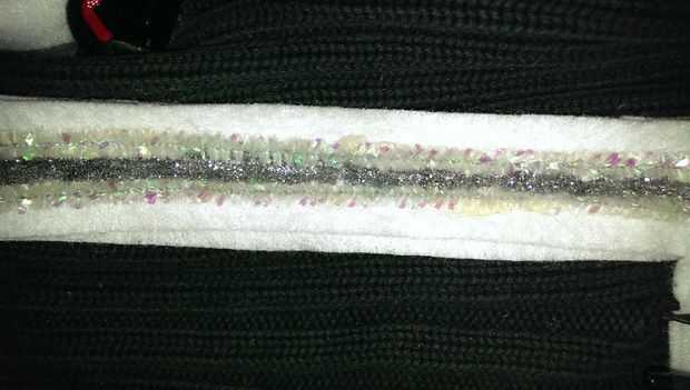 Lo siguiente que hice fue crear la envolvente de la chimenea y decorarlo.  Usé el manto y fieltro blanco para el exterior.  Capas de varias piezas utilizando un pegamento artesanal/tela clara en su mayor parte.  Para piezas que no comencé usando pegamento caliente.  Usé algunos perla/brillante tipo limpiapipas para crear las líneas verticales se pueden ver talladas en madera en una chimenea para añadir dimensión.  En la capa superior, dejó un poco no se adhiere por lo que la tableta podría deslizar debajo de él un poco para cubrir los bordes de la bolsa un poco.  También llené en la columna entre los limpiadores de pipa con una pintura de tela de plata brillante.