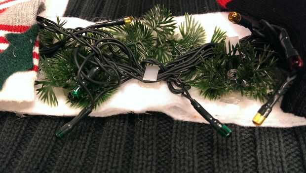 Para decorar la chimenea, caliente pegué varios pedazos de plantas de acuario en la parte superior.  A continuación, añadí clips de alambre que ya tuve con pegamento caliente, así.  (ver siguiente paso para las luces)