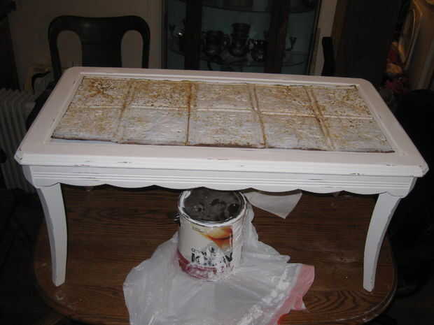 4. corte un pedazo de cielo raso de lata antiguo para encajar la parte superior de la tabla.